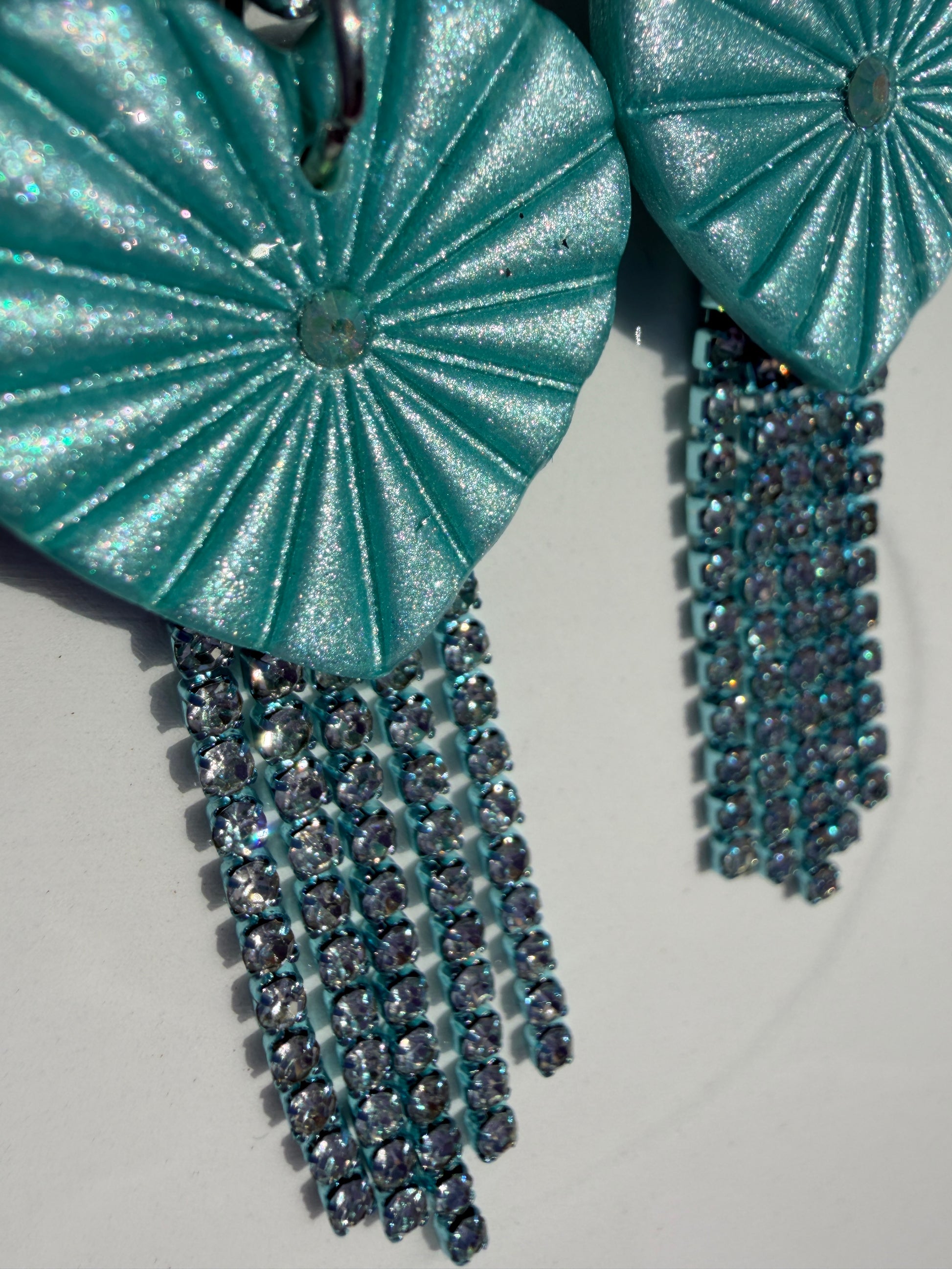 These stunning pearlescent light blue and chrome clay nested heart earrings are set off by a stunning cascade of sparkling blue clad white rhinestone fringe. These come with sensitive friendly stainless steel stud ear backs.